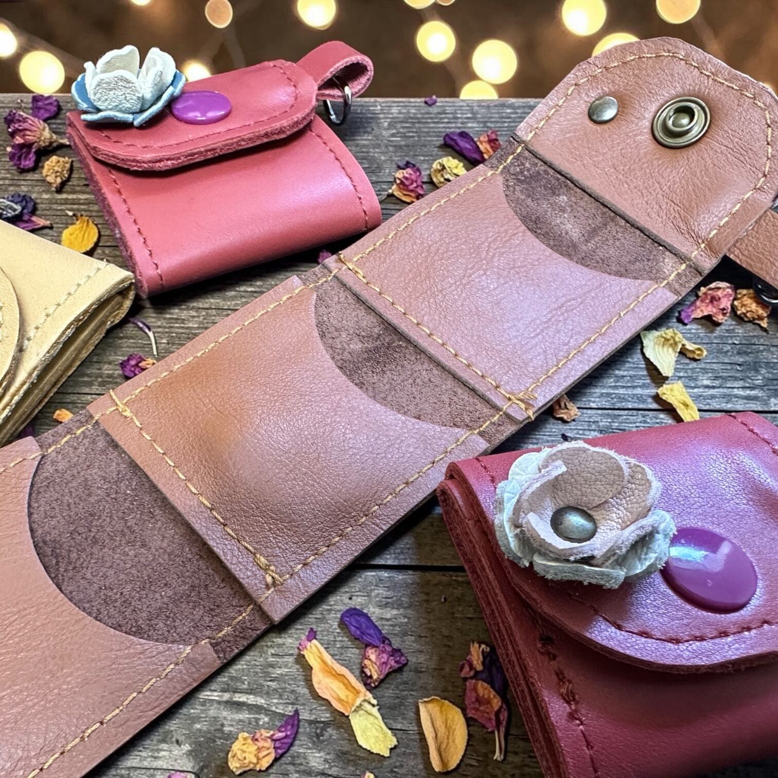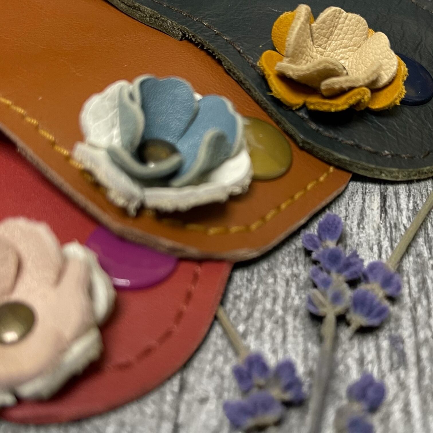 素材: 牛革(本体は落ち着いた大地の色、お花はパステルカラーの端切れを使用)