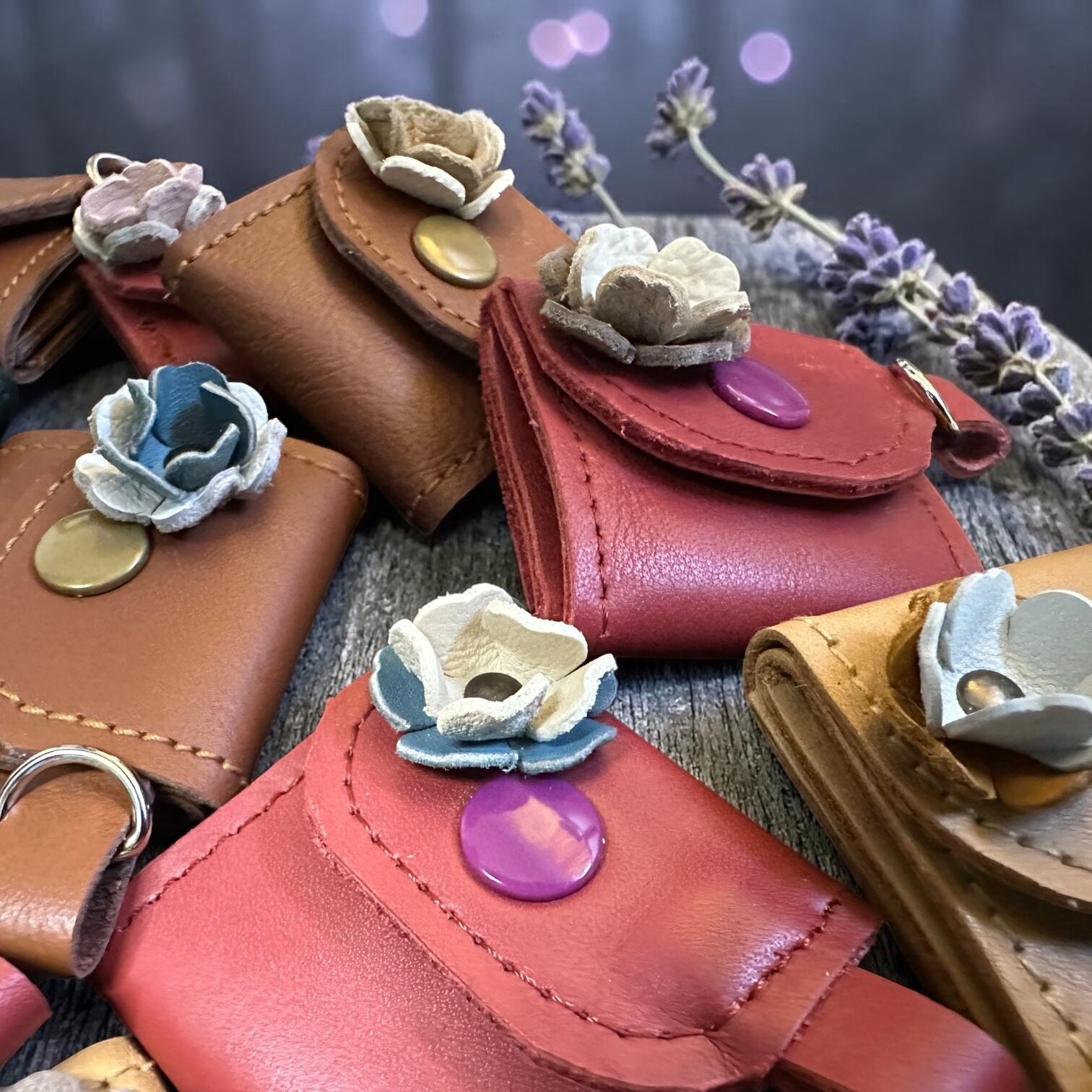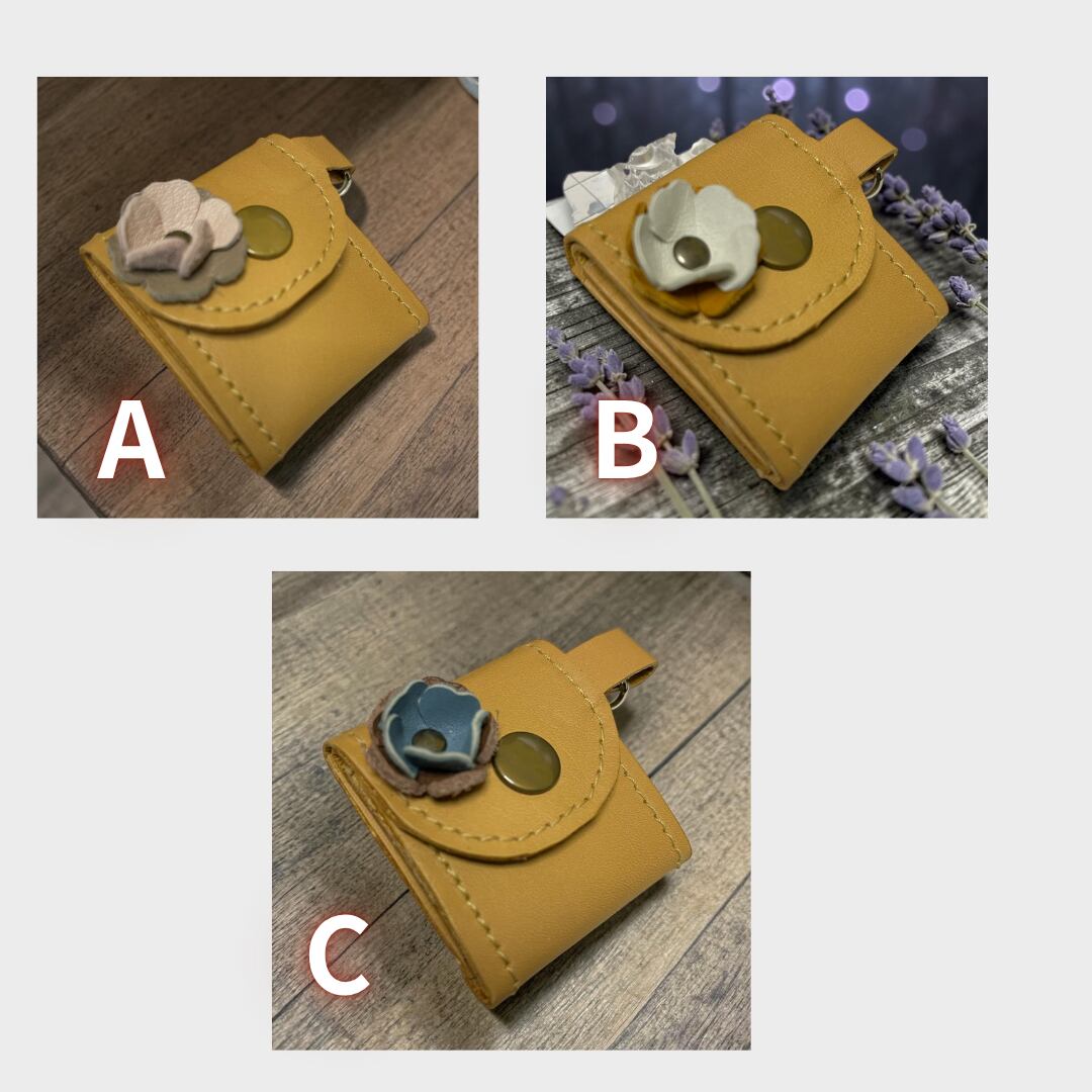 素材: 牛革(本体は落ち着いた大地の色、お花はパステルカラーの端切れを使用)